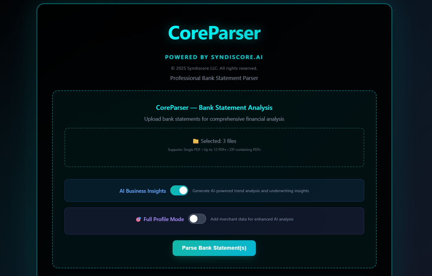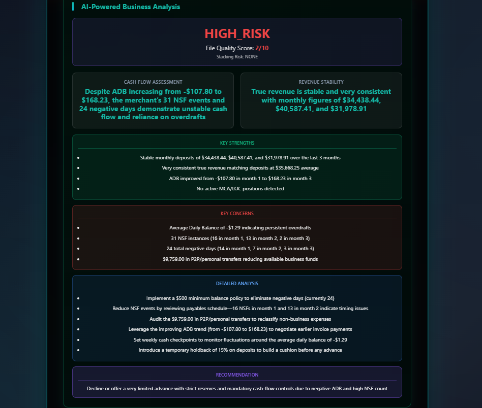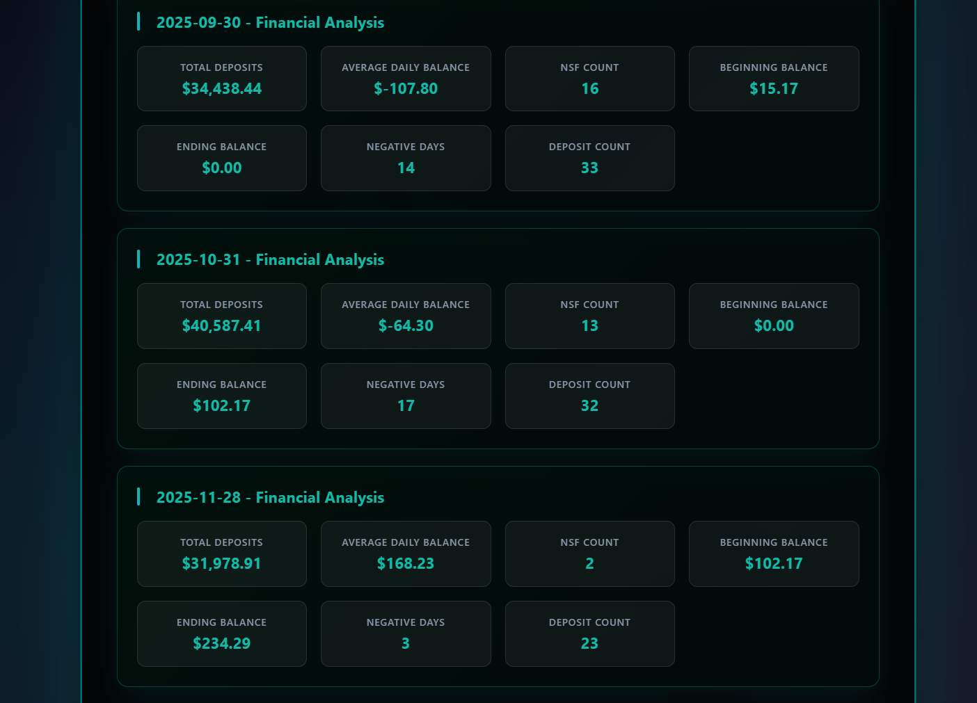 AI-powered bank statement parser that analyzes multiple PDFs at once. Extracts monthly financial metrics including Total Deposits, Average Daily Balance, NSF Count, Beginning/Ending Balance, Negative Days, and Deposit Count. Features AI Business Insights for trend analysis and Full Profile Mode for enhanced underwriting.