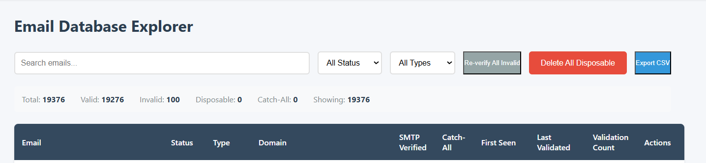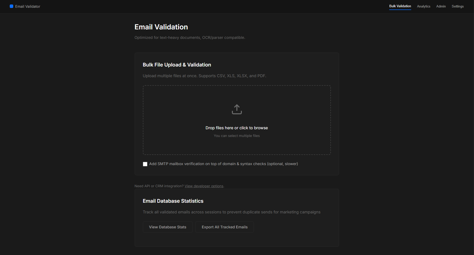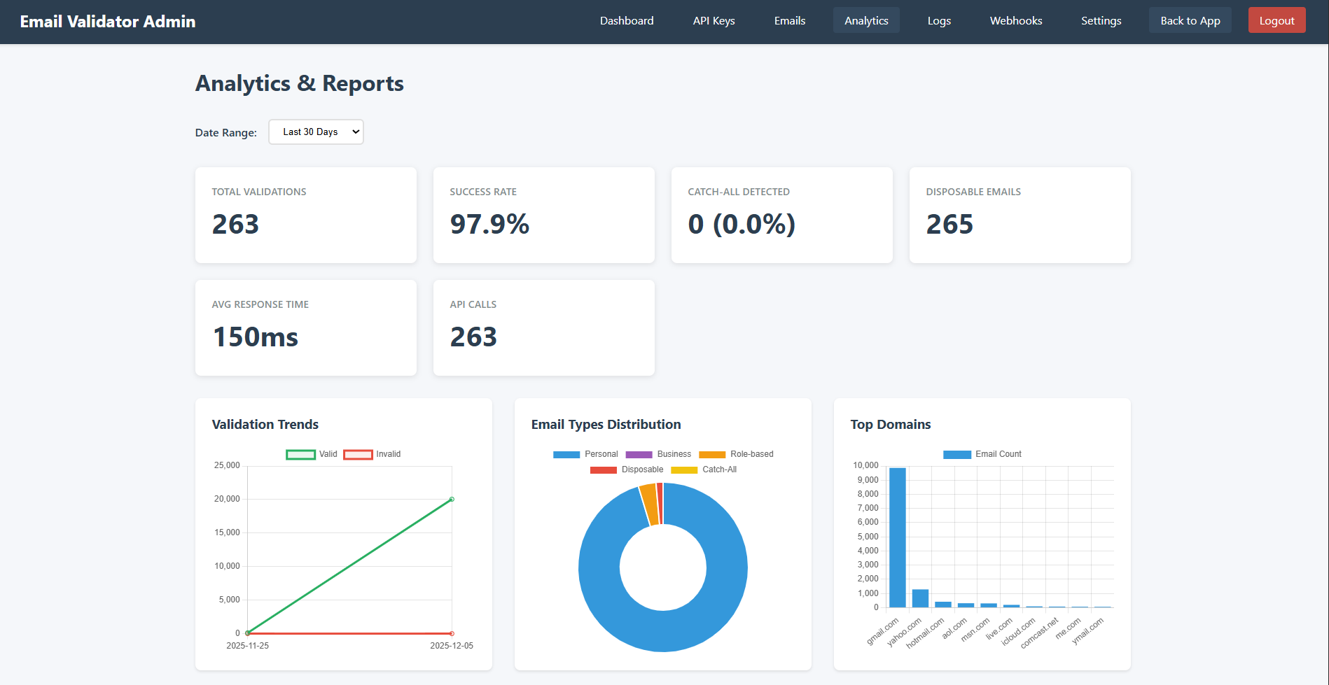 Bulk email verification service with file upload validation, SMTP verification, and risk scoring. Features an admin dashboard with analytics & reports showing validation trends, email type distribution, and top domains. Includes Email Database Explorer for managing validated emails with status, type, domain, catch-all detection, and validation reasoning.