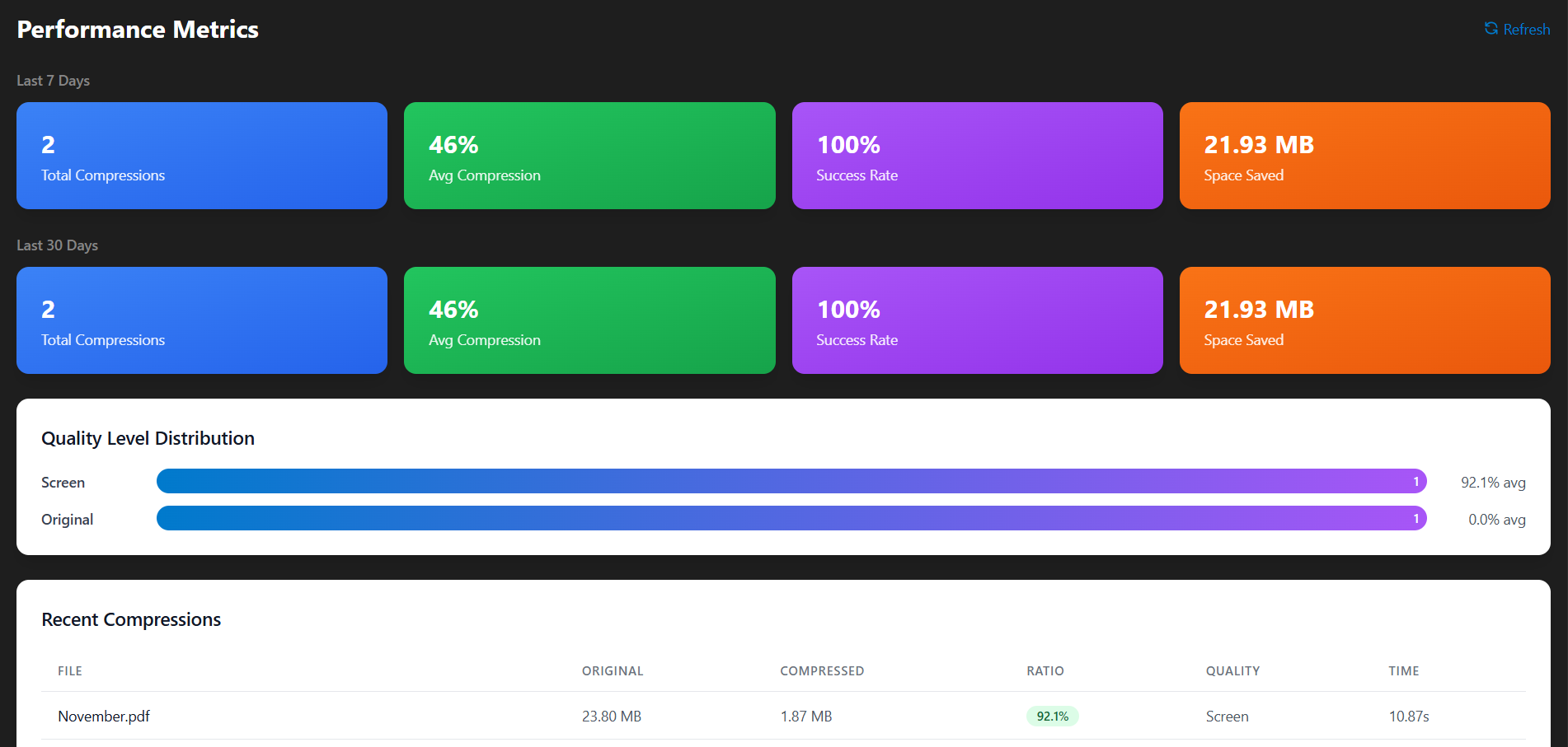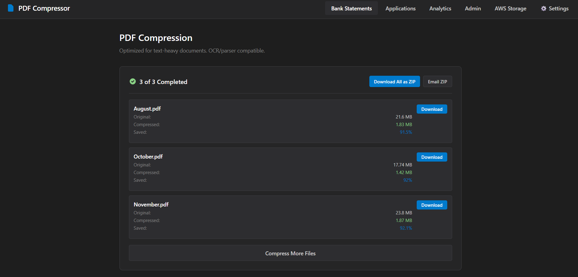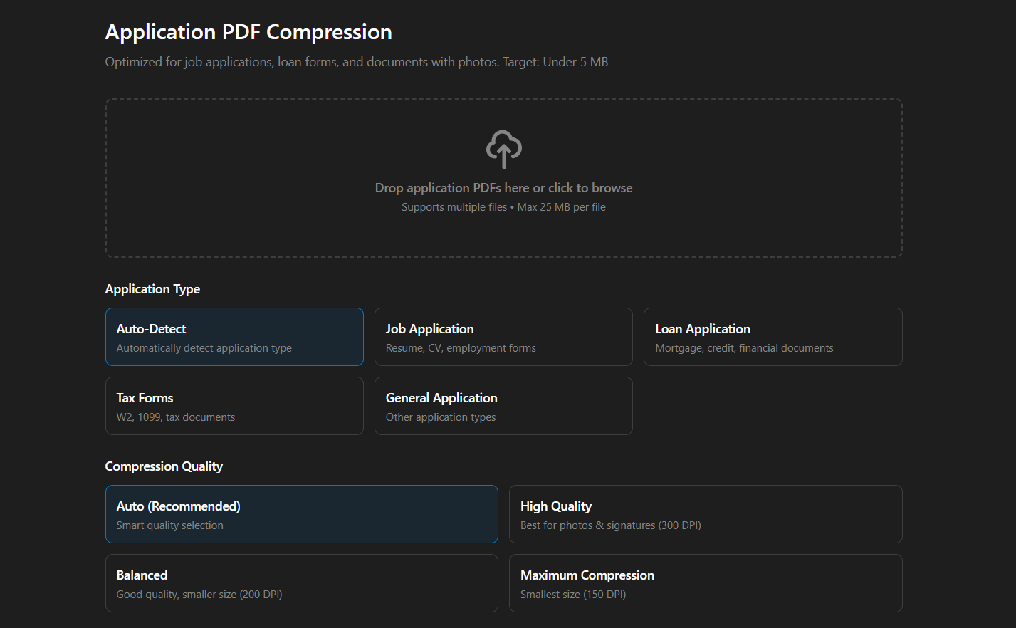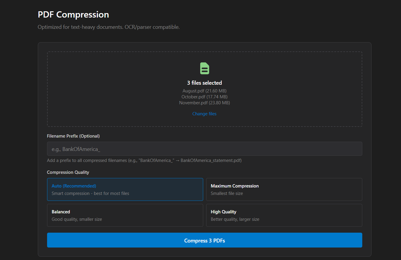 PDF compression tool optimized for text-heavy documents. OCR and parser compatible. Features batch processing with custom filename prefixes, and four compression quality modes: Auto (recommended), Maximum, Balanced, and High Quality.