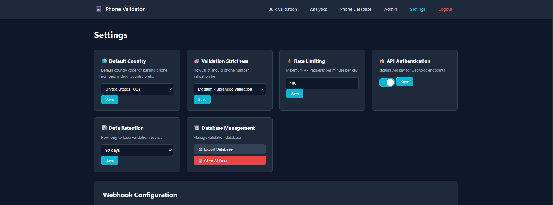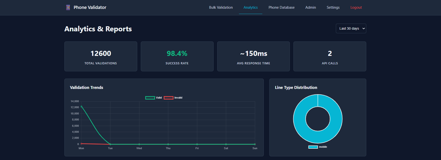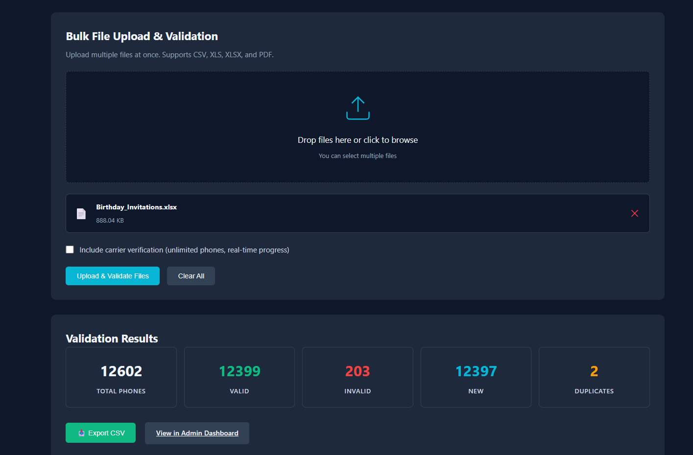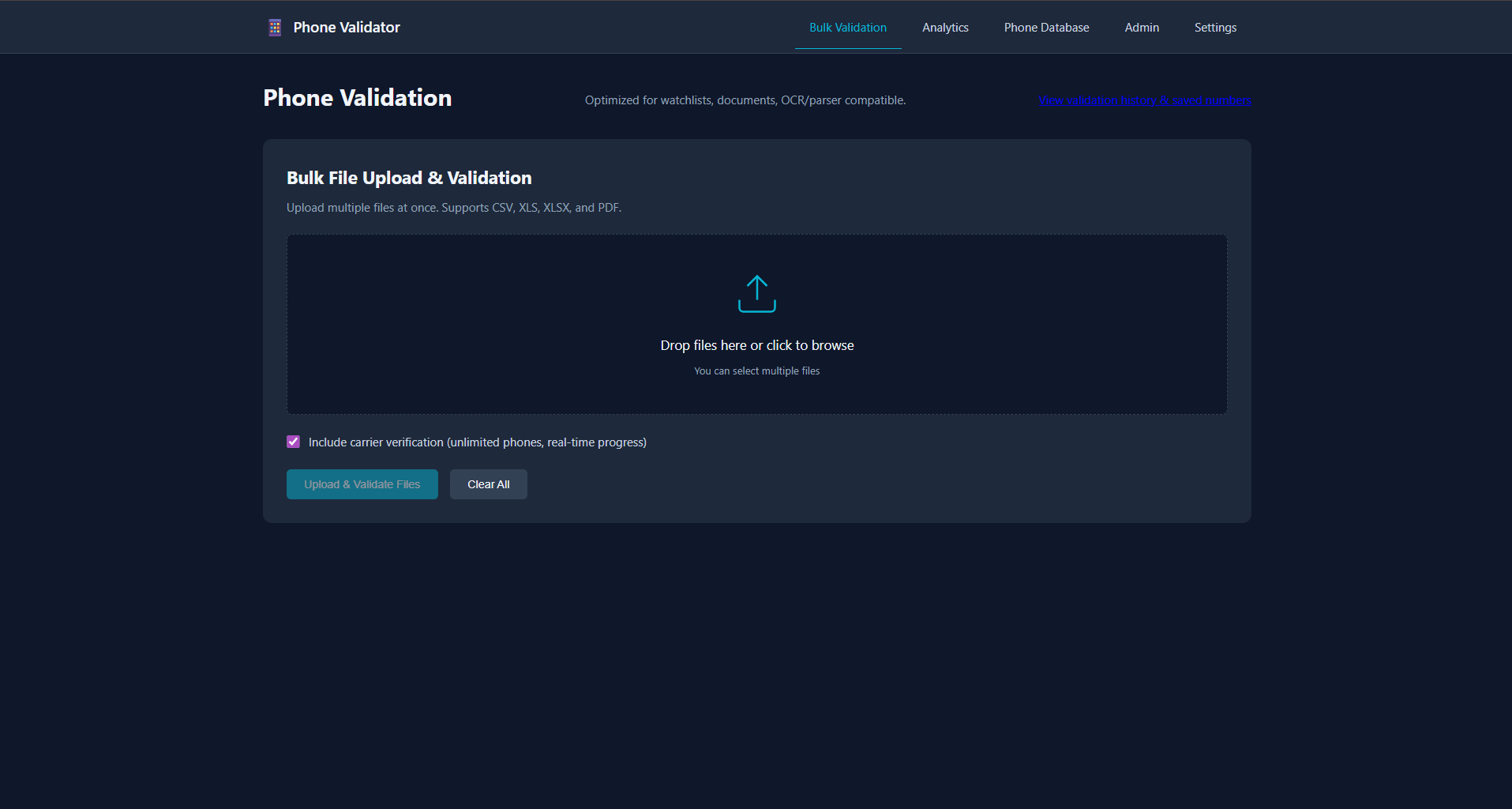 Bulk phone validation service optimized for watchlists, documents, and OCR/parser compatibility. Supports CSV, XLS, XLSX, and PDF uploads with real-time carrier verification. Features analytics dashboard, phone database explorer, and admin settings.