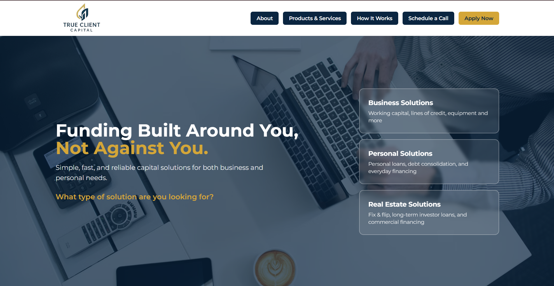 Professional fintech website for a lending company. Clean design with lead capture forms and CRM integration.
